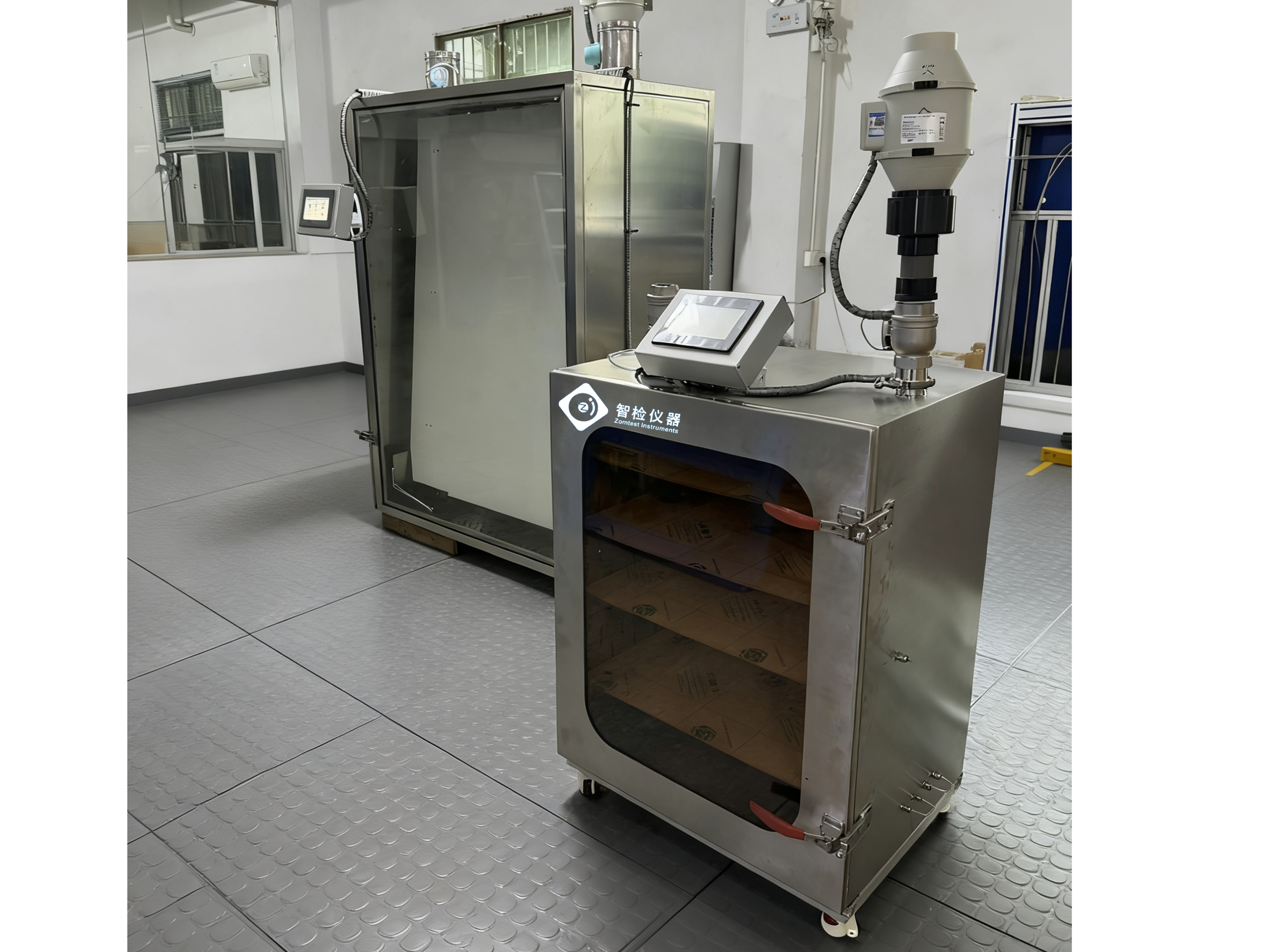 The equipment is intended for gas alarm or Carbon monoxide alarm testing and calibration in mass production in advantage of its big volume. The equipment provides a sealed stainless-steel chamber with glass door for monitoring alarm status. The special designed big open door can close and secure easily without gas leakage. The volume of chamber and size of samples shelves are custom-made. It can contain about 60 alarms. The controller control high speed valve to inject quantitative high concentration gas into chamber and the gas stirred by circulating fan to get homogeneous test gas in certain concentration. That gas will be test gas for response test or threshold setting of gas alarm product. The circulating fan and porous plate are also specially arranged to get uniform test gas and avoid the high concentrating gas getting into alarm directly during gas injection.