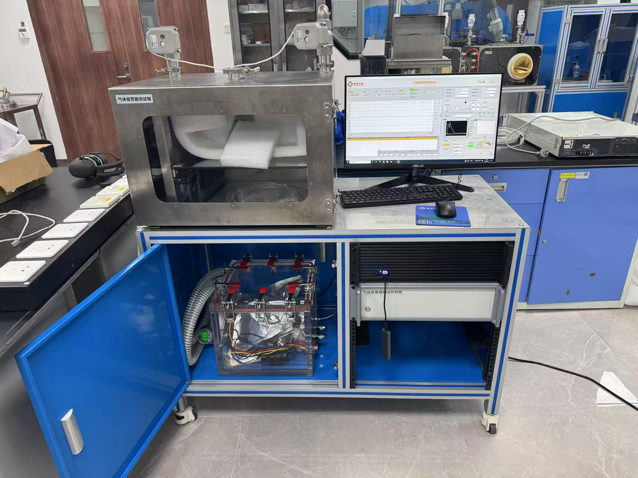 The equipment is intended for gas alarm or Carbon monoxide alarm sampling test. The equipment provides a sealed stainless-steel chamber with glass door for monitoring alarm status. The volume of chamber and size of samples shelves are custom-made. It can contain about 10 alarms. The controller control high speed valve to inject quantitative high concentration gas into chamber and the gas stirred by circulating fan to get homogeneous test gas in certain concentration. That gas will be test gas for response test or threshold setting of gas alarm product. The air speed are adjustable to get uniform test gas and avoid the high concentrating gas getting into alarm directly during gas injection.